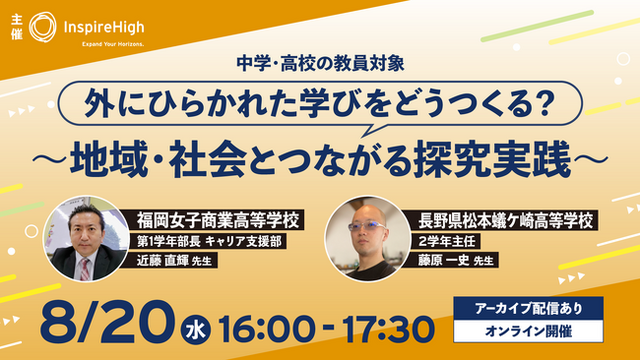 「世界とつながる探究的な学びを手軽に教室で」をコンセプトとしたEdTech教材を提供する、株式会社Inspire High(本社:東京都千代田区、代表:杉浦太一)は、地域・社会とつながる探究学習の実践例を紹介する、中高教員向けのオンラインセミナーを8/20(水)に開催します。