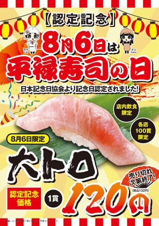 株式会社 焼肉坂井ホールディングス(本社:名古屋市北区、代表取締役社長 高橋仁志)は毎年8月6日を「平禄寿司の日」として一般社団法人 日本記念日協会に申請し、承認をいただきました。記念日は1号店がオープンした日が1967年8月6日(日)に由来いたします。そして、平禄寿司ではこの記念日制定キャンペーンとしまして8月6日(水)、通常1貫390円の「大トロ」を120円(税込132円)でご提供いたします。(店舗により販売価格が異なります)店内飲食・各店舗100貫限定でございます。皆さまのご来店をスタッフ一同お待ちしております。