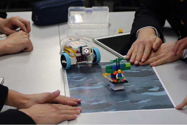 ESECの取り組みの月極域探査機(LUPEX)プロジェクトで使用する「近赤外画像分光装置(ALIS)」をイメージしたミッションを実施。プログラミングを使って「障害物をよけ、水氷を見つけて報告」することがゴール。ブロックでできた模擬人工衛星をプログラミングで操作し、移動させるだけでなく、カラーセンサーを利用して、地形やブロックの色を識別させるミッションに挑戦。