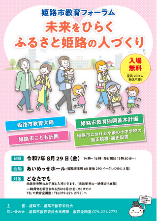 「姫路の教育が目指すもの」と題し、本市の教育大綱、こども計画、教育振興基本計画、今後の小中学校の適正規模・適正配置についてその概要を説明するほか、「社会全体で支える子どもの健やかな成長」と題したパネルディスカッションを実施します。