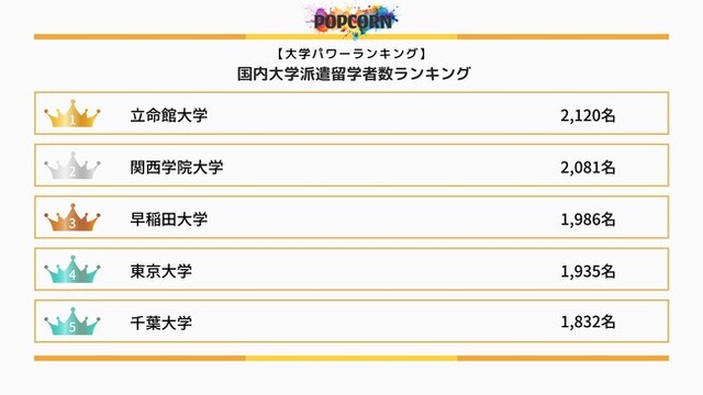 ポップコーン株式会社(本社:東京都渋谷区千駄ヶ谷5‑21‑5 601、代表取締役:大澤 陽平、URL:https://ppcn.co.jp/)は、2025年8月5日(火)、自社運営メディア「大学パワーラインキング」にて『海外派遣留学者数ランキング』を公開いたしました。