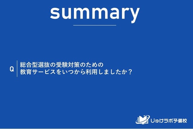 じゅけラボ予備校(所在地:大阪市北区、代表取締役:後藤智則)は、この度、総合型選抜入試で教育サービスを利用した18歳から21歳の男女84名(活動実績あり77人・活動実績なし7人)を対象に、教育サービスの利用開始時期についての関係性について調査を実施しました。