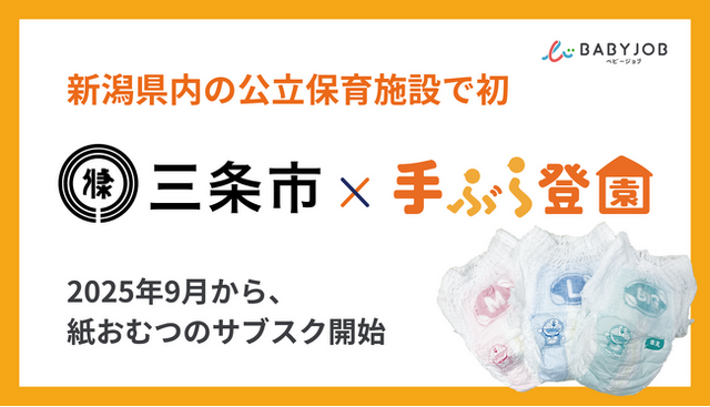 BABY JOB株式会社(本社:大阪府大阪市、代表取締役 上野公嗣)は、2025年9月より新潟県三条市のすべての公立保育施設(9園)において、保育施設向けの紙おむつとおしりふきのサブスク「手ぶら登園」が開始されます。特に今回は、保育士が使いやすい専用おむつが採用され、新潟県内の公立保育施設では初となります。