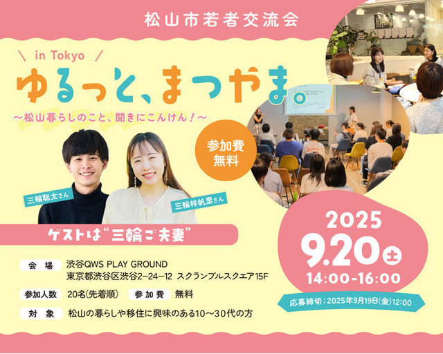 そこで、松山の暮らしやすさや転職情報、子育て環境などを知る機会として、都市圏に在住の若い世代に向けた交流会「ゆるっと、まつやま。in Tokyo ~松山暮らしのこと、聞きにこんけん!~」を初めて開催いたします。
