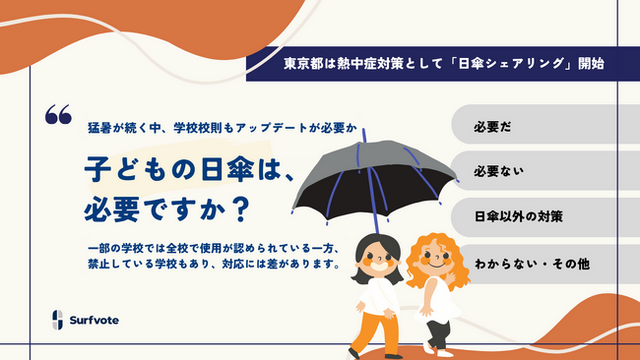Surfvote「こどもに日傘は必要ですか?」:https://surfvote.com/issues/rjlu355o4iy5