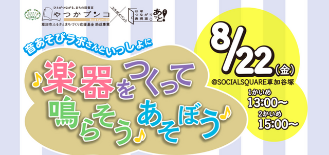 ソーシャルスクエア草加谷塚店(運営法人:NPO法人ソーシャルデザインワークス 代表理事:北山剛)と音楽を通じて地域活動を広げる「音あそびラボ」さんがコラボ!8/22(金)に「楽器をつくって鳴らそう♪あそぼう♪」イベントを開催します!