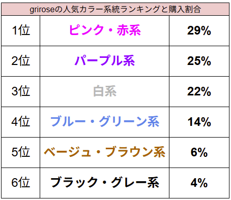 griroseでは、2025年2月12日(水)から8月5日(火)までの購入モデルからカラー系統を集計し、ランキングにまとめました。1位はgriroseでもカラーバリエーションが多い「ピンク・赤系」、2位は僅差で「パープル系」がランクインしました。昨今人気のピンク・パープルが全体の5割以上を占め、定番カラーとして定着していることがわかります。griroseでは、同じ色系統でも、つややかなエナメル調、パールのような光沢感、エレガントな色味や落ち着いたニュアンスカラーなど、質感やトーンの違いを楽しめるラインアップをご用意。大人が見ても心躍る、上品で可愛らしいカラー展開が特徴です。