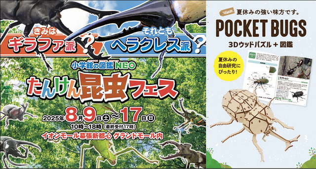 株式会社プラザクリエイト(本社:東京都中央区/代表取締役社長:新谷 隼人)は、シリーズ累計出荷数280万個突破の大人気 DIY クラフトキット「つくるんです(R)」の図鑑付き3Dウッドパズル『ポケットバグズ』シリーズ全種類を、2025年8月9日(土)から17日(日)にかけて、イオンモール幕張新都心で開催される「小学館の図鑑NEO たんけん昆虫フェス きみはギラファ派? それともヘラクレス派?」にて、ここだけの特別価格で販売します。