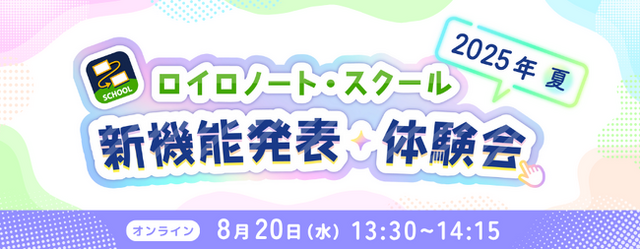 私たちLoiLoは、8月20日(水)「新機能発表・体験会 2025年夏」をオンライン開催します。2025年4月以降に追加されたロイロノート・スクールの新機能をじっくり体験できるイベントです。参加費は無料です。この機会にぜひご参加ください。