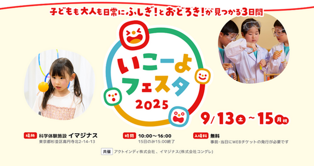 子どもとお出かけ情報サイト「いこーよ」(https://iko-yo.net/)を運営するアクトインディ株式会社(東京都品川区、代表取締役:下元敬道)は、この度、初の自社イベントとなる体験型イベント『いこーよフェスタ2025』を2025年9月13日(土)から15日(月・祝)までの3日間、東京都杉並区高円寺の科学体験施設「イマジナス」にて入場無料で開催いたします。