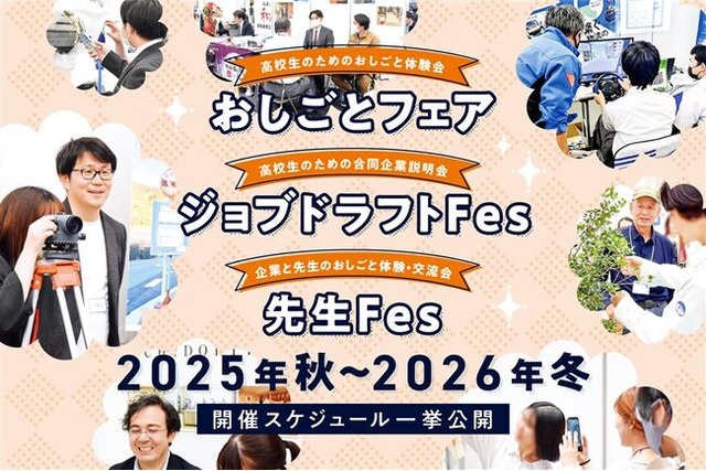 このたび、高校生が地域の大人との交流やおしごと“体験”を通して将来を考えるきっかけとする「おしごとフェア」、1日で就職先を検討できる合同企業説明会「ジョブドラフトFes」、そして高校生をサポートする先生に向けた交流会「先生Fes」を新たに開催することとなりました。