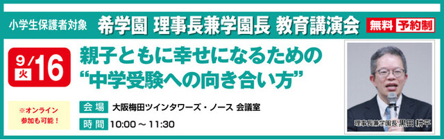 この度、希学園 理事長 兼 学園長 黒田 耕平が小学生の保護者の方を対象に下記要領にて希学園 理事長 兼 学園長 黒田 耕平の教育講演会を開催いたします。