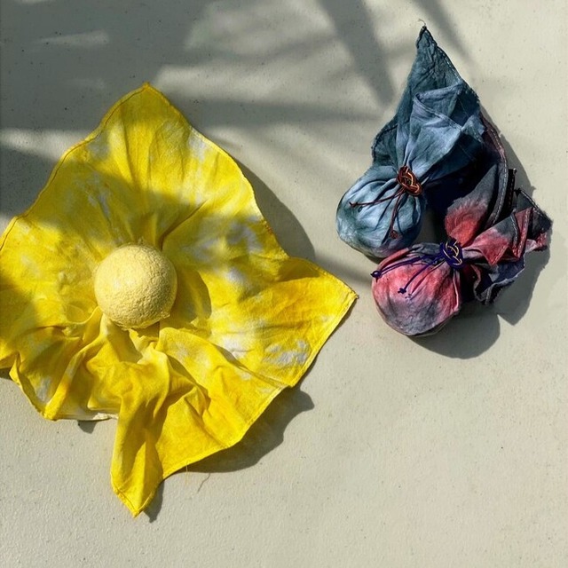 湯に溶ける前の物語──鮮やかな手ぬぐい包みが、香りと彩りを秘めたバスボムをやさしく包み込みます。