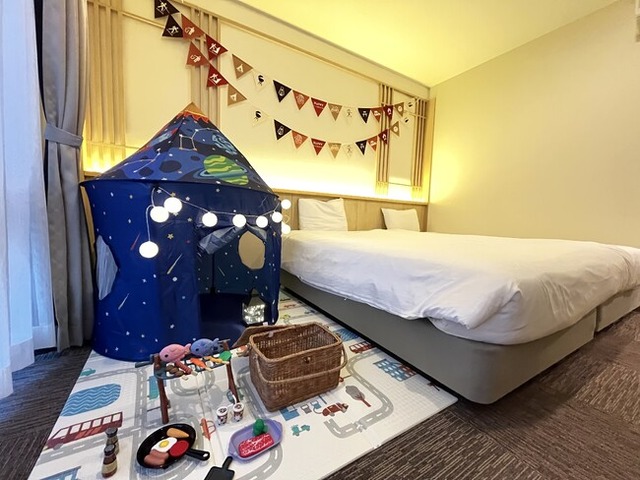 「キッズキャンパールーム」は、客室を小さなキャンプ場にみたて、お子様用テント、おままごとバーベキューセット、プラネタリウムをご用意した、お子様がいらっしゃるファミリーのお客様に、手軽にキャンプ体験をお楽しみいただける客室です。小さいお子様用のトイレ練習用補助便座とオムツ専用ゴミ箱を設置し、お子様用のガウン、タオルと、キッズアメニティとして歯ブラシ、ボディスポンジ、スリッパもご用意しています。バスルームとトイレが別々で、ファミリーのお客様に使いやすい客室です。価格は朝食付16,200 円~、素泊まり13,000 円~(いずれも1泊1部屋、税サ込)。