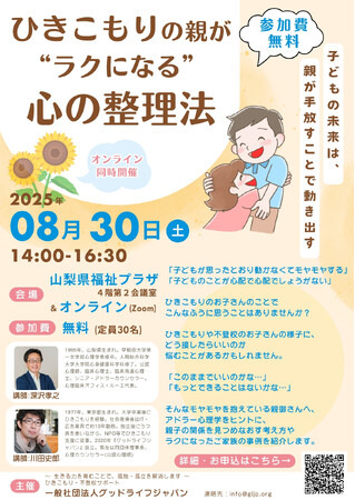生きる力をを育むことで孤立孤独を解消します~ひきこもり・不登校サポートの一般社団法人グッドライフジャパン(山梨県北杜市須玉町江草5573 代表:川田史郎)は、アドラー心理学をヒントに、ひきこもり・不登校の子をもつ親御さんに向けた「ひきこもりの親が“ラクになる”心の整理法」を開催いたします。