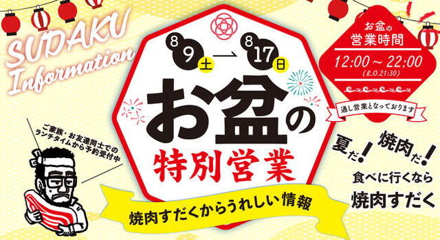 株式会社総合近江牛商社(本社:滋賀県守山市/代表取締役社長:西野立寛)が運営する直営の「近江焼肉ホルモンすだく」「焼肉すだく家族亭」「近江牛ホルモン畜産すだく」では、2025年のお盆期間(8月9日(土)~8月17日(日))に特別営業を実施いたします。