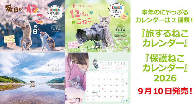 今年はもうひとつ、ミルクボランティアとして離乳前のねこをひきとり、里親につなぐまでの活動を積極的に行っている保護ねこ写真家・三吉良典さんによる『にゃっぷる 保護ねこカレンダー2026 卓上版』も同日、2025年9月10日より発売いたします。