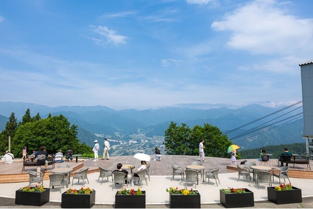 眼前には谷川連峰から越後三山までの雄大な山々の大パノラマ、kumo cafeオープンデッキ