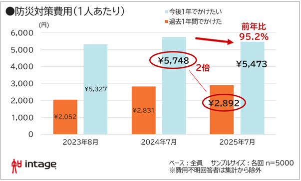 なお、インテージでは、2024年2月・8月に緊急調査も実施。こちらではそれぞれかけたい費用が5,674円・5,930円と高水準を示していました。特に昨年8月の一時的な伸びは、南海トラフ地震臨時情報発令による影響と見られますが、今回調査ではそこから450円余り減少する結果に。こうした変化は、図表1で示された防災意識の揺らぎを、静かに裏付けているように見えます。