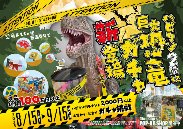福井駅西口の商業施設「ハピリンモール」では、2025年8月15日(金)~9月15日(月・祝)の期間、現在開催中の『恐竜POP UP SHOP』館内連携企画第2弾として「カプセル機能付き巨大恐竜モニュメント」を公開します。高さ約2メートルのインパクト抜群なガチャ機で、恐竜モチーフのグッズや人気おもちゃが当たる、夏休みにぴったりの体験型イベントです。さらに館内一部店舗では、恐竜モチーフのメニューやお土産も販売し、館内を巡って“恐竜づくし”を楽しめます。