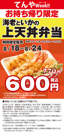 ロイヤルグループが展開する天丼・天ぷら専門店「天丼てんや」では、日頃よりご愛顧いただいているお客様への感謝の気持ちを込めて、月に一度「海老といかの上天丼弁当(通常価格 税込770円)」を特別価格 税込600円で販売する「てんやWeek!!」を毎月実施しております。また、8月18日(月)~8月24日(日)に実施する「8月のてんやWeek!!」では、お持ち帰り弁当・盛合わせをご購入のお客様を対象に「お持ち帰り限定 えび天1本無料券」を各店1,000枚限定で配布いたします※。ぜひこの機会に「天丼てんや」のお持ち帰りをご利用ください。