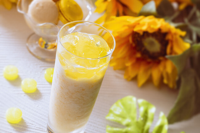 北海道・伊達の濃厚な牛乳を使った牛乳を使ったスムージーに上にはぷるんっと甘酸っぱいパインゼリーをトッピング!口に入れた瞬間、南国気分にトリップしますよ。