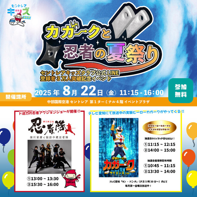 「カガークと忍者の夏祭り ~セントレアキッズクラブ公式LINE 登録者3 万人突破記念イベント~」日時 : 2025 年8月22日(金) 11:15~16:00