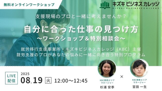就労移行支援事業所・キズキビジネスカレッジ(KBC)は2025年8月19日(火)に、「自分に合った仕事の見つけ方」をテーマにした無料オンラインワークショップを開催します。