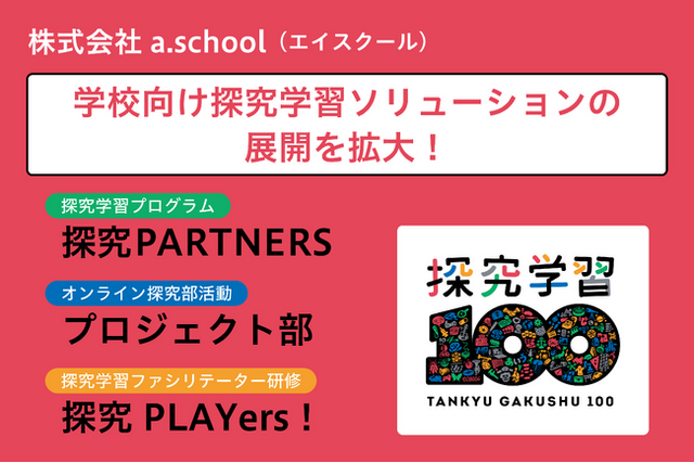 株式会社a.school(東京都文京区、代表取締役:岩田拓真、以下「エイスクール」)は、「誰もがつくり手として、豊かな人生を送れる社会へ」をビジョンに掲げ、探究・創造的な学びを社会全体に広げる多様な教育サービスを展開しています。このたびエイスクールは、探究学習をめぐる学校現場のさまざまな課題解決に向け、学校向け探究学習ソリューションの展開を拡大いたします(対象:学校および教育委員会、自治体、企業)。