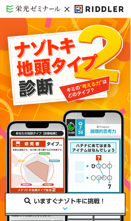 謎解きクリエイター松丸亮吾率いるRIDDLER(リドラ)株式会社(本社:東京都豊島区 代表取締役:松丸亮吾)は、大手進学塾「栄光ゼミナール」(運営:株式会社栄光 本社:東京都千代田区 代表取締役社長:下田勝昭)とコラボし、スマートフォンで小学生から大人まで誰でも無料で楽しめる「ナゾトキ地頭タイプ診断2」を、2025年8月18日(月)より公開します。