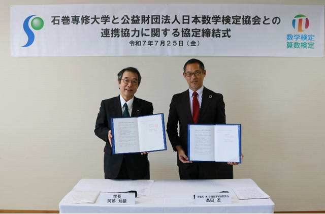 2025年7月25日(金)、石巻専修大学(所在地:宮城県石巻市、学長:阿部知顕)と公益財団法人日本数学検定協会(所在地:東京都台東区、理事長:高田忍)は、相互の連携協力に関する協定締結式を石巻専修大学で執り行いました。本協定にもとづき、算数・数学力向上を目的とした各種共同研究などを通じて、相互の発展に加え、地域社会の活性化などをめざしてまいります。