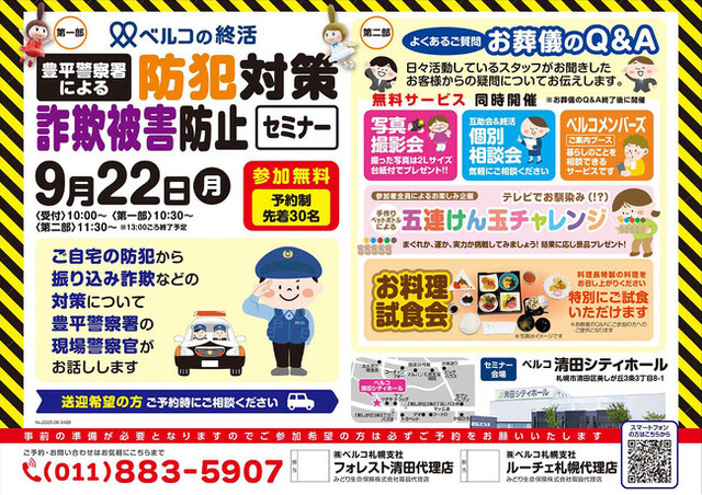 冠婚葬祭サービスを提供する株式会社ベルコは、2025年9月22日(月)、「ベルコの終活」イベントの一環として、防犯対策・詐欺被害防止セミナーをベルコ清田シティホール(北海道札幌市清田区美しが丘三条3-8-1)にて開催します。