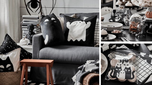 KUSTFYR/クストフィール コレクションは、フレンドリーそうなオバケやおしゃべりなネコをイメージしたデコレーション、かぼちゃのライトチェーン、おばけと不気味なクモのグラフィカルなクッションなど、見た目はキュートでどこかミステリアスな商品が揃います。