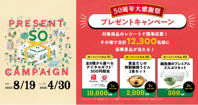 50周年にあたり、消費者の皆さまへ感謝の気持ちを込め、対象商品を購入するともらえるポイントを貯めて応募すると、選べるデジタルギフト(500円相当)や特製鍋焼うどん、オリジナルグッズが総勢12,300名様に当たるキャンペーン「50周年大感謝祭」を開催いたします。