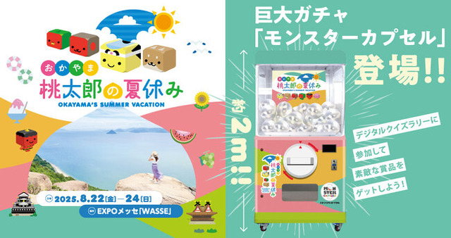 巨大ガチャ「モンスターカプセル」の企画・運営を行う株式会社グリーグローブ(本社:東京都文京区/代表取締役:上村 正治)は、2025年8月22日(金)~8月24日(日)の3日間、大阪・関西万博EXPOメッセ「WASSE」(屋内展示場)において、岡山県が実施するおかやま「桃太郎の夏休み~OKAYAMA’S SUMMER VACATION~」に高さ2.0mの巨大ガチャ「モンスターカプセル」を提供します。ブース内で開催されるデジタルクイズラリーをクリアすることで巨大ガチャ「モンスターカプセル」に挑戦することができ、素敵な賞品がGETできます。