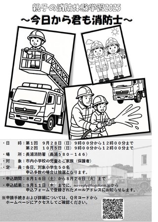 市では、親子で楽しみながら様々な消防活動の体験や見学することにより、防火意識の向上と消防に対する理解を深めることを目的に、「親子の消防体験学習」を開催します。今年度も多くの児童に参加していただけるよう2日間実施します。