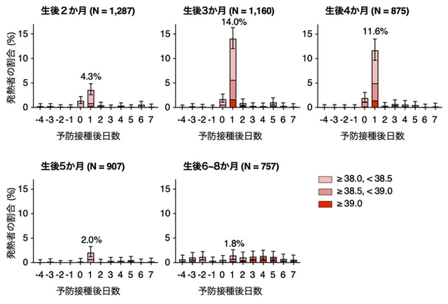 月齢ごとのワクチン接種前後での発熱者の割合を表示(ワクチンの種類は限定せず、同時接種を含む)。ワクチン接種後の発熱は接種翌日にピークがあり、接種後2日目にはどの月齢でも大半の乳幼児が解熱する。また、生後3・4か月ではワクチン接種後に発熱する乳幼児割合が多く見られた。
