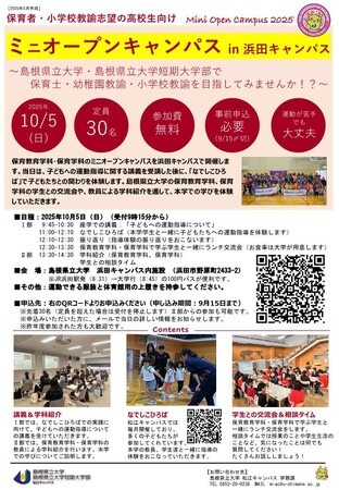 島根県立大学松江キャンパスでは、保育教育学科・保育学科のミニ・オープンキャンパスを浜田キャンパスで開催します。当日は、子どもへの運動指導に関する講義を受講した後に、「なでしこひろば」で子どもたちとの関わりを体験します。この体験を通じて、子どもへの運動指導とコミュニケーションの方法を学ぶことができます。