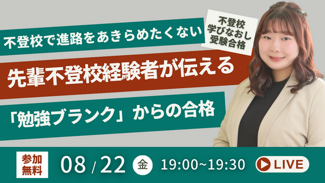テーマは「【【不登校からの学び直し・受験合格】不登校を理由に進路をあきらめたくない!先輩不登校経験者が伝える「勉強ブランク」突破のヒント」。