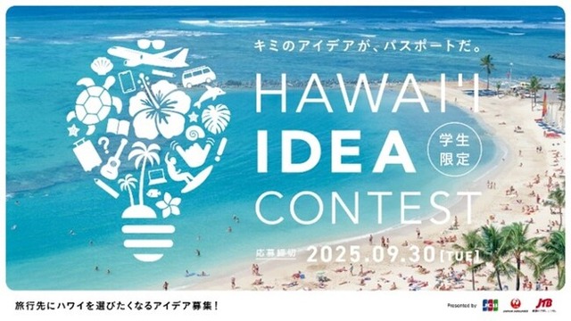 株式会社ジェーシービー(本社:東京都港区、代表取締役会長兼執行役員社長:二重 孝好 、以下:JCB)は、日本航空株式会社(以下、JAL)、株式会社JTB(以下、JTB)とともに、3社で初の共同プロジェクトとなる「ハワイアイデアコンテスト」の募集を本日8月20日(水)から開始いたします。応募対象は18歳~29歳の学生とし、「旅行先にハワイを選びたくなるアイデア」をテーマに斬新なアイデアを募集します。