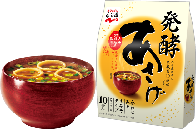 商品名「発酵あさげ」には、日本の伝統発酵食品である味噌の魅力を最大限に引き出したいという想いを込めました。味づくりでは、永谷園独自の「みそ両仕込み製法」により味噌の旨味とコク深さを引き出すことができました。またパッケージデザインも、「あさげ」の世界観を踏襲しつつ発酵の力強さと上質感を表現しました。