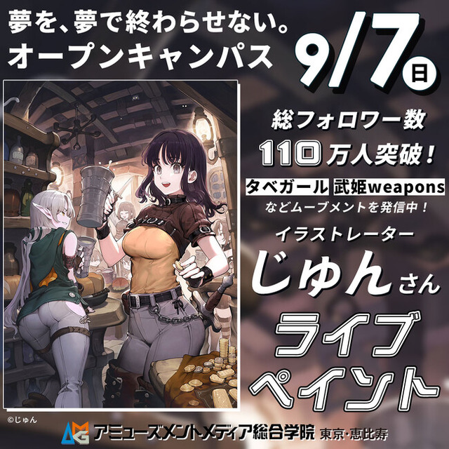 ゲームの3Dデザインやキャラクターデザイン、書籍の表紙イラストから、SNS発の「タベガール」「武姫weapons」等で数々の魅力的なイラストやムーブメントを発信している、じゅんさんのイラストメイキングが間近に見られるライブイベントです。