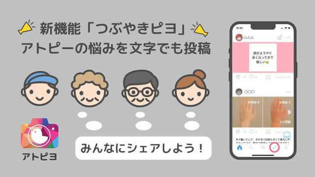 アトピヨ合同会社(所在地:千葉県市川市、代表:赤穂 亮太郎)は、アトピー患者向け匿名画像SNS「アトピヨ」において、画像なしで文字投稿できる新機能「つぶやきピヨ」を2025年8月21日(木)に追加したことをお知らせします。また、画像投稿においては、画像をぼかして表示するモザイク機能も追加したことをお知らせします。
