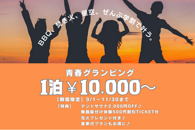 澄んだ空気の中で焚き火を囲み、星空を見上げながら仲間と語らう--そんな特別な時間を、学生だけの“学割プラン”でお得に楽しめます。
