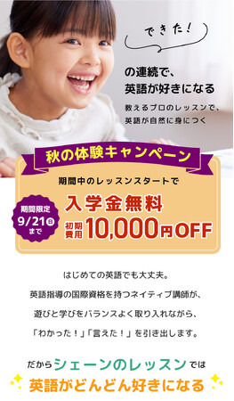 株式会社増進会ホールディングス(Z会グループ)のグループ会社、株式会社シェーンコーポレーション(本社:東京都新宿区 代表取締役社長:石谷雄也)が運営する英会話スクール「シェーン英会話」は、秋の体験キャンペーンを2025年9月1日(月)~9月21日(日)に開催します。