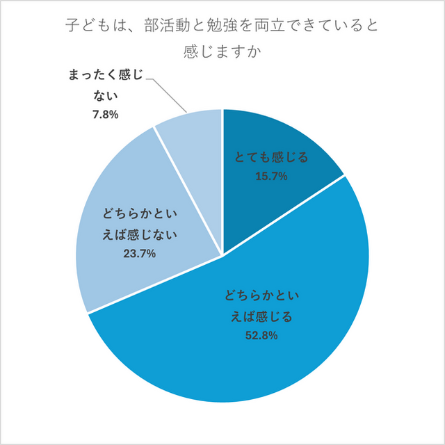 「とても感じる」が15.7%、「どちらかといえば感じる」が52.8%となった。多くの保護者が、子どもが部活動と勉強を両立できていると感じており、両立しようとする姿勢や努力を評価しているようだ。