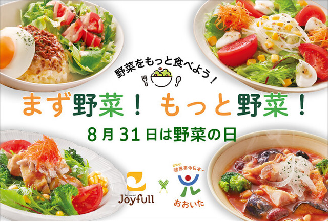 また、ジョイフルでは近年の健康志向の高まりとともに、野菜をたっぷり使ったメニューを取り揃えているため、この度、8月31日の「野菜の日」を機に、大分県と更なる協力関係のもと、健康寿命日本一活動のひとつである「まず野菜、もっと野菜」プロジェクトを推進していくことになりました。