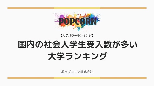 ポップコーン株式会社(本社:東京都渋谷区千駄ヶ谷5-21-5 601、代表取締役:大澤 陽平、URL:https://ppcn.co.jp/)は、2025年8月26日(火)、メディア「大学パワーランキング」にて『国内の社会人学生受入数が多い大学ランキング(2025年最新版)』を公開いたしました。
