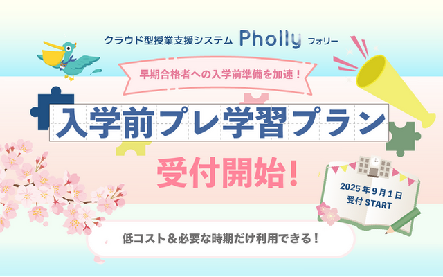 「入学前プレ学習プラン」は、早期合格者が決まる11月から入学直前の4月までの期間限定で、Phollyをご利用いただけるプランです。ユーザー数上限50名まで、6か月間で総額90,000円(税別)という低価格でご利用いただけます。ぜひこの機会にお申し込みください。