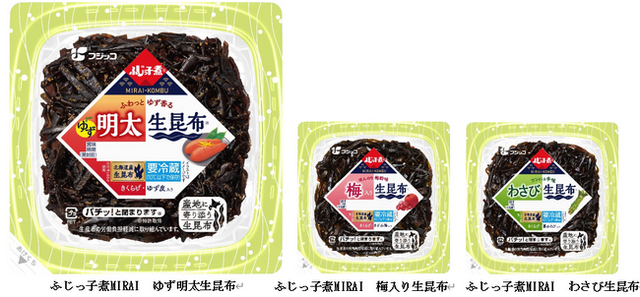 生昆布を使った商品開発を開始してから4年目を迎え、より多くのお客様に「ふじっ子煮MIRAI」シリーズを知っていただくために、幅広い世代から人気のごはんのお供「明太子」のおいしさとゆずの香りを組み合わせた「ふじっ子煮MIRAI ゆず明太生昆布」を新たに発売いたします。また、「ふじっ子煮MIRAI 梅入り生昆布」「ふじっ子煮MIRAI わさび生昆布」についても、より視覚的に分かりやすく伝えるためにパッケージをリニューアルしました。